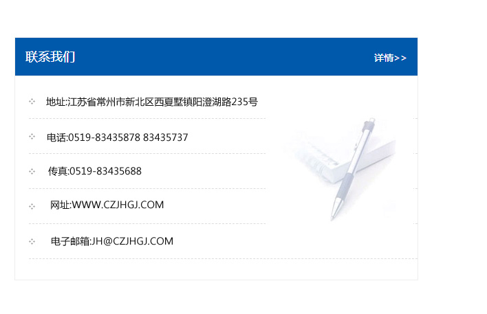 地址:常州市新北區(qū)友邦商務(wù)大廈1幢16、17層  電話:0519-85101652  傳真:0519-85112595  郵編:213022  網(wǎng)址:www.cz-jiayue_cn.hn-tiansheng.com  郵箱:xiajifengaa@163.com